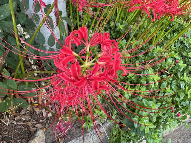先日、駐車場から現場に向かう途中の神社敷地内でヒガンバナが咲いていたのでパシリ