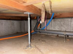 ⇑こちらは工事前の床下状況で既存キッチンの給水、給湯、排水管がみえます。