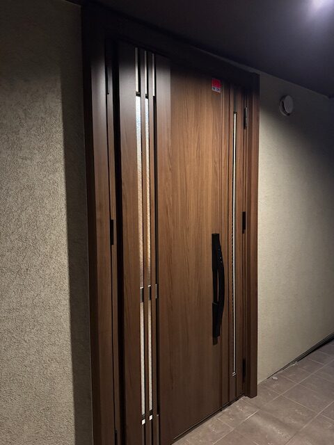 デザインと色あいが近いものを選定し取付しましたが、新規ドアは電子錠となりますので開閉も楽々になります。