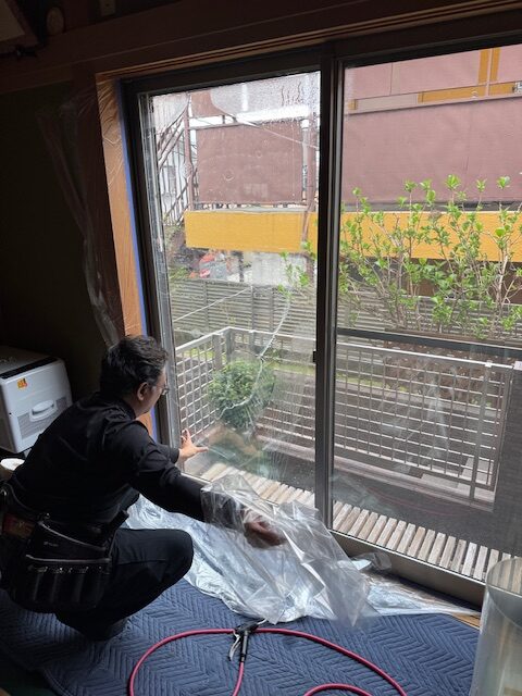 松戸市内で戸建て住宅のサッシガラス面に防犯フィルムを張る作業を行いました。